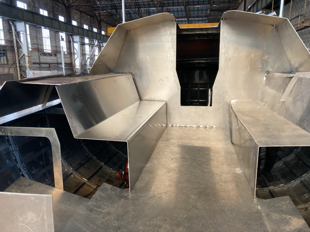 La coque a été réalisée et assemblée dans nos ateliers et a été livrée brute de chaudronnerie, décotellée et poncée.