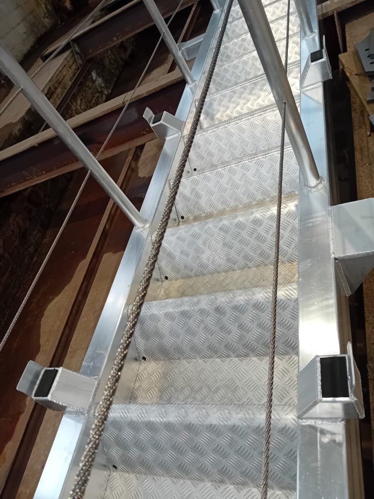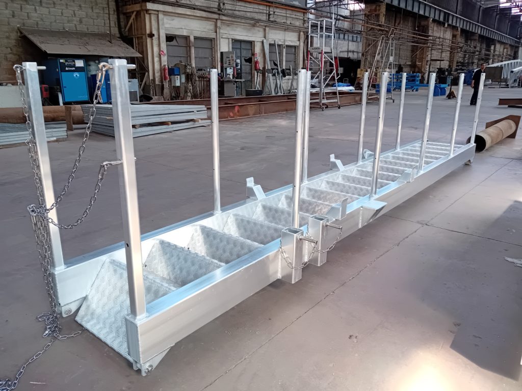 De plus, la passerelle comprend une articulation pour fixation sur navire, un planchon de 6 m x 0.60 m et des pitons de levage et de verrouillage.