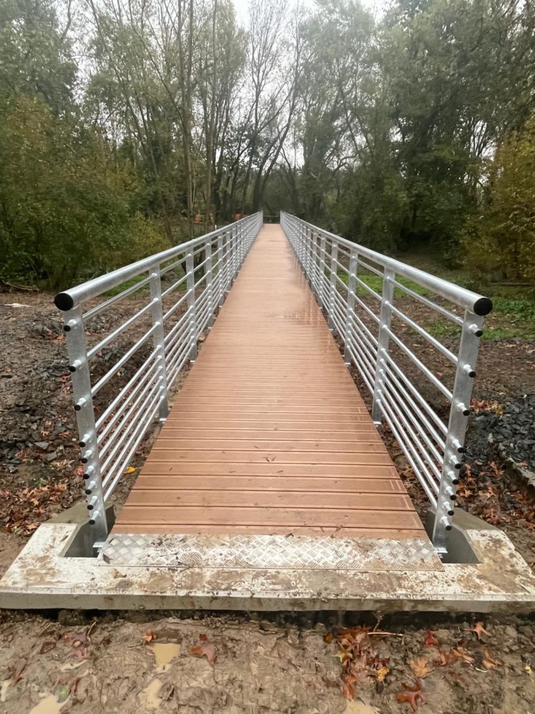 Cette passerelle de 40 m x 1,50 m en 3 travées de 15,11 m, 14,96 m et 10,10 m installée à Saint-Sébastien-sur-Loire franchissant le cours d’eau « Le Boireau » se compose d’une structure en acier, d’un platelage en composite bois polymère, et de garde-corps par barreaudage horizontal.